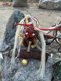 Made of goat skull, deer antlers, cowrie shells, bones, horse hair yarn, acrylic paint/pens snake skin, wooden snakes, rusty metal bones & horse hair were gifted to me), Cooper wire, rabbit foot, cigar. (you will have you to buy your own gin for goat god).